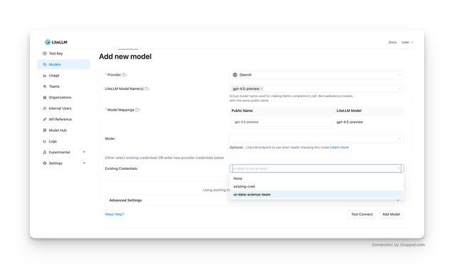 Select your LLM provider, enter your API Key and click "Add Credential"